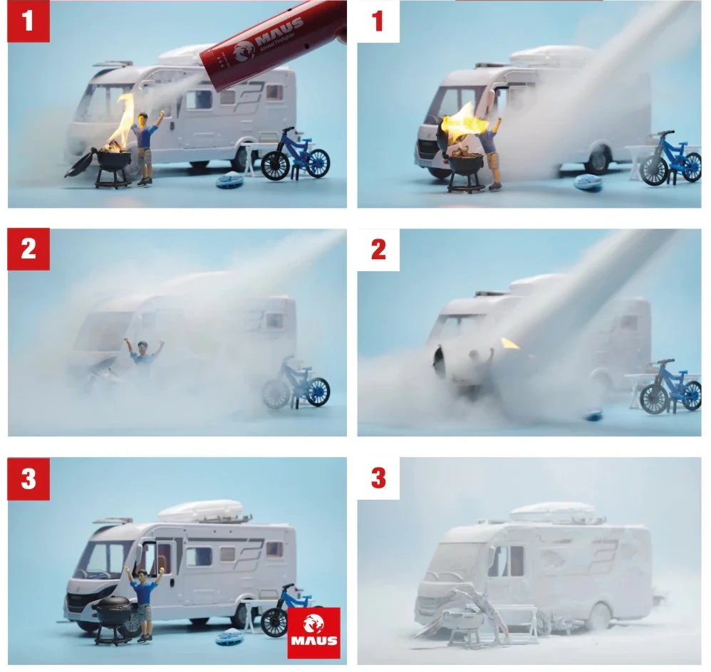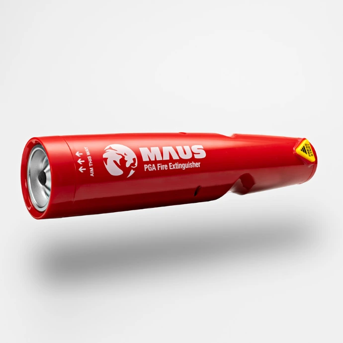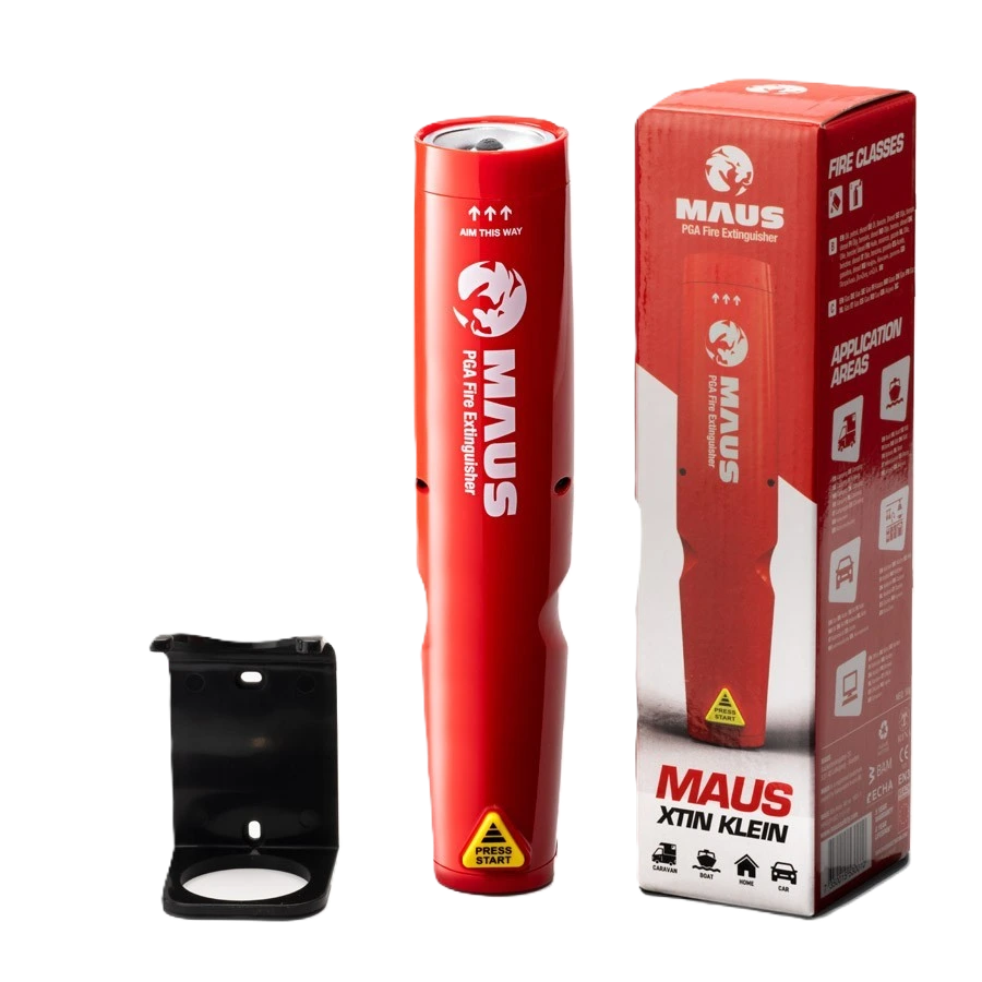 The Maus XTIN Klein extinguisher fights fire using a potassium-based aerosol (smoke) that leaves no traces of powder, foam or other extinguisher residues.
